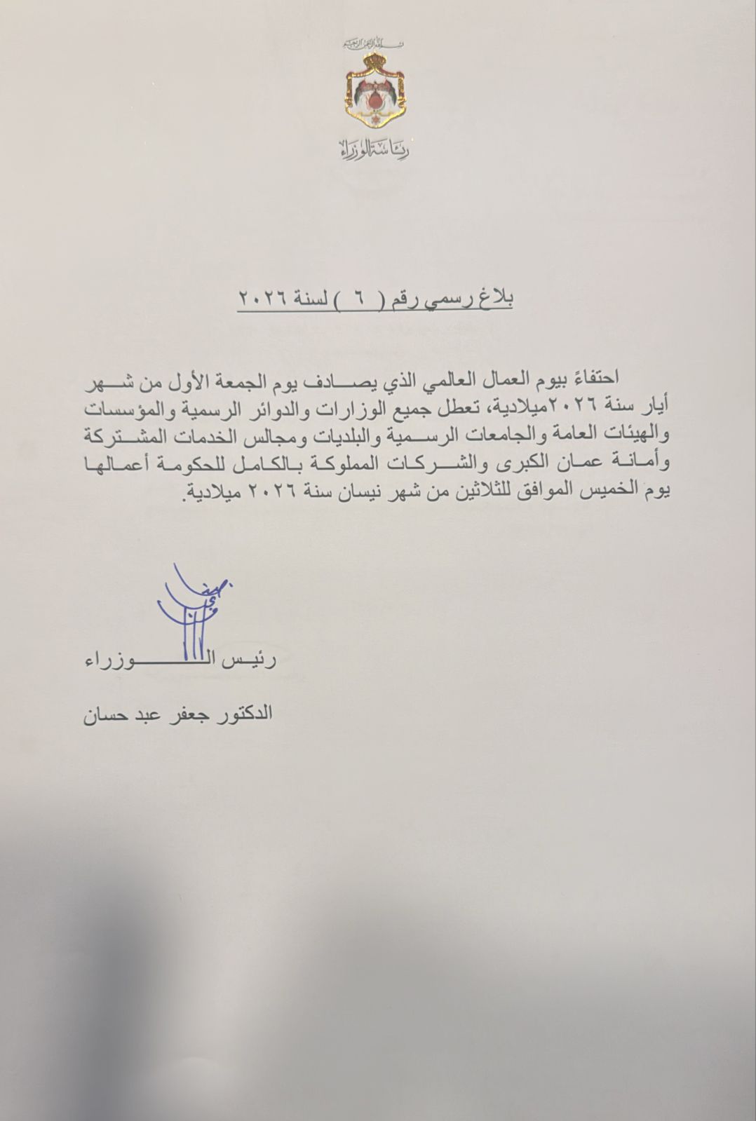 بلاغ رسمي رقم (6) لسنة 2026 بخصوص عطلة يوم العمال العالمي
